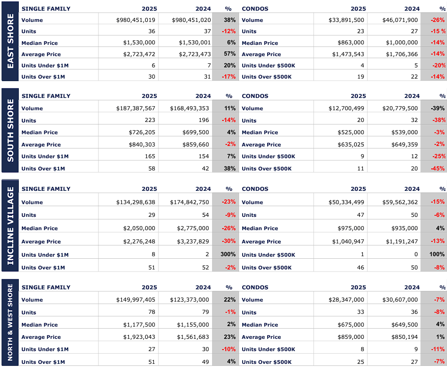 The latest real estate data for Lake Tahoe is in—and it paints a striking picture as we transition from 2024 to 2025. The region is seeing a clear divergence between the single-family home and condo markets, with each telling its own story.